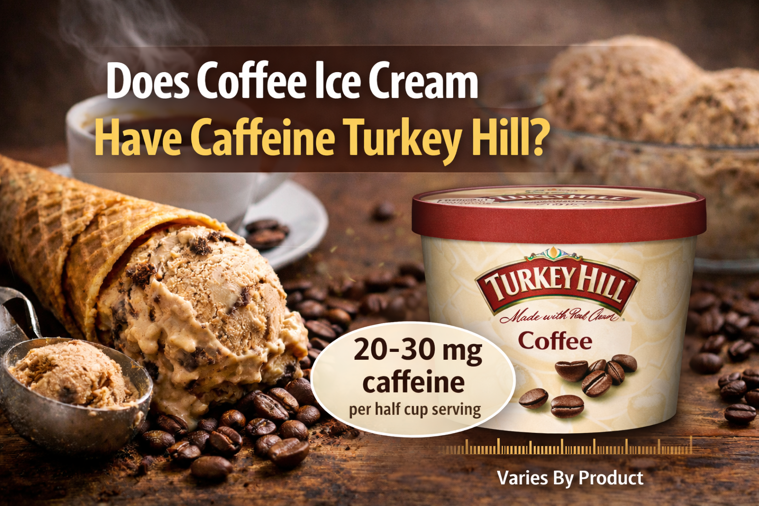 Does coffee Ice Cream have caffeine? Turkey Hill depends on the product type. Turkey Hill coffee ice cream typically contains 20 to 30 milligrams of caffeine per serving. This level is considered mild and safe for most adults.