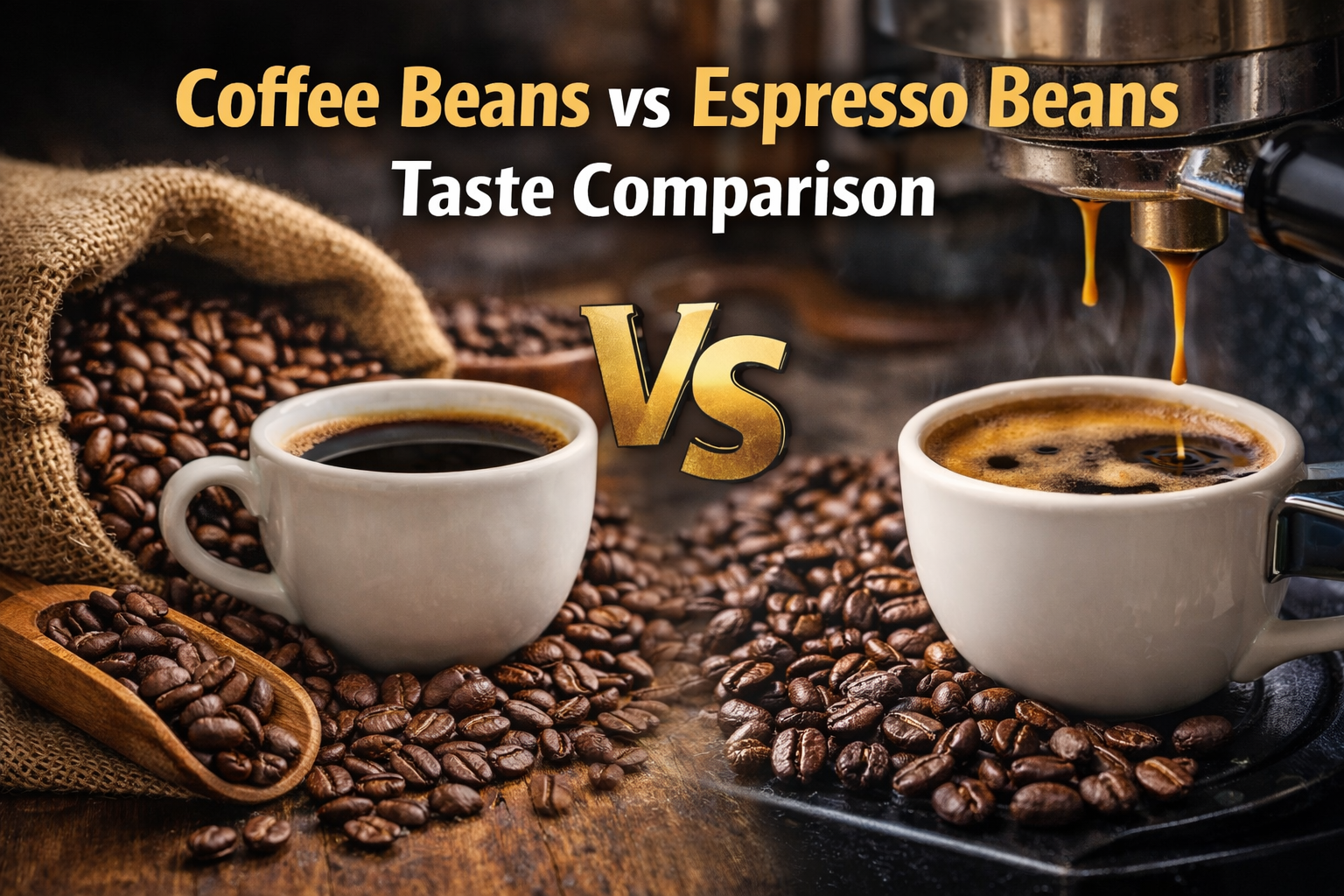 Espresso beans create bold flavor and a strong aroma. Coffee beans create a smooth and layered taste. Caffeine depends on preparation, not bean name.